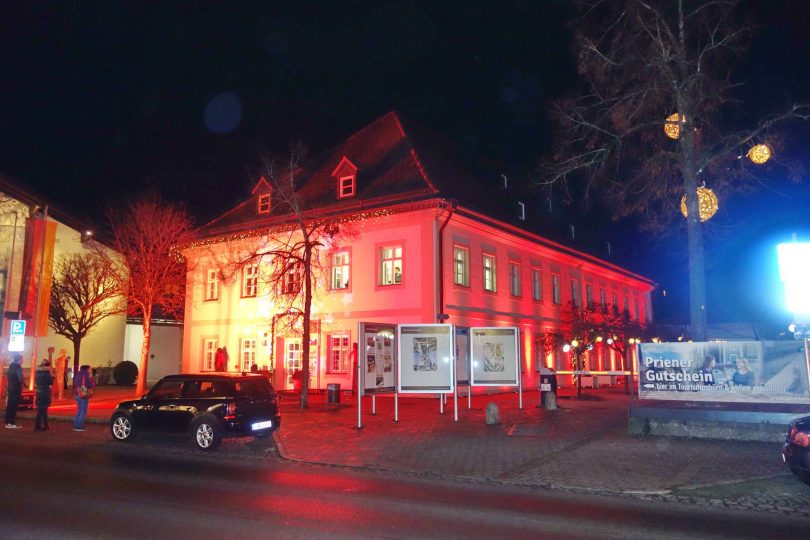 “In Zeiten wie diesen ist es leider nicht möglich, beim Christkindlmarkt zusammenzukommen und die Zeit des Advents zu spüren, aber mit den Belichtungen von Häusern können wir eine Art moderner Kerzen schaffen” – mit diesen Gedanken freute sich Andrea Hübner als Geschäftsführerin der Prien Marketing GmbH (PriMa) über das große und mit Abstand gezeigte Interesse als das Haus des Gastes in sanftem Rot illuminiert wurde. Aus dem ersten Stock und aus zwei geöffneten Fenstern ertönten dabei Blasmusikweisen der Familie Rosenwink aus Prutdorf, was zum Farbenzauber auch einen musikalischen Genuss und letztlich alles zusammen für ein Advents-Gefühl beitrug. Das Konzept der PriMa ist es, auch an den kommenden Advents-Sonntagen Gebäude rund um die Pfarrkirche “Maria Himmelfahrt” zu erleuchten, am Sonntag, 27. Dezember ist dann noch ein gesamtes Beleuchten -und wenn es Corona erlaubt- auch ein musikalisches Programm geplant.