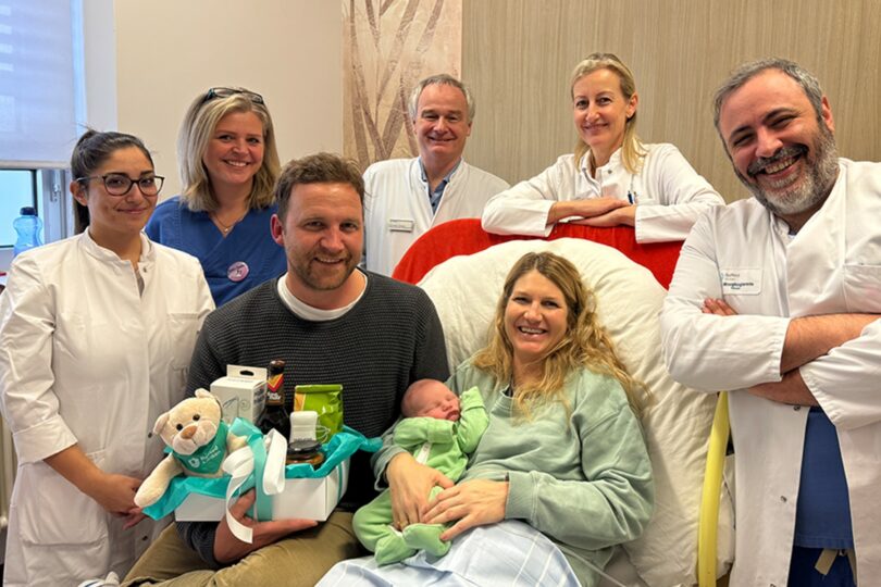 Die Leiterin der Geburtshilfe, Dr. Angela Kirschenhofer, sowie der Chefarzt der Klinik für Gynäkologie und Geburtshilfe, Privatdozent Dr. Andreas Schnelzer ließen es sich nicht nehmen, der Familie mit einem Geschenkkorb persönlich zu gratulieren. Über den Nachwuchs freuten sich nicht nur die Eltern und der „große“ Bruder, sondern auch Hebamme Sandra Aumer (zweite von links) und das Neujahrs-Dienstteam der Klinik für Gynäkologie und Geburtshilfe des RoMed Klinikums Rosenheim.