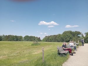 Sonnenklar: rechts sitzen Leute auf den Bänken, links sind die Bänke frei. Links sind die Wiesen vor der Mahd, rechts danach.