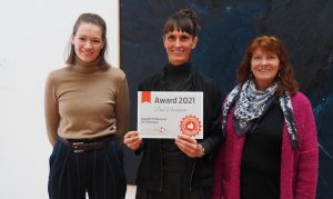 Museumsleiterin Dr. Maria Schindelegger (Mitte), Vanessa Zmudzinski (li) und Angelika Ruby (re) vom Museumsteam mit der Auszeichnung vor Georg Baselitz´ Bild “schwerer weißler ardzad, 2013”. Foto: DASMAXIMUM, © Georg Baselitz