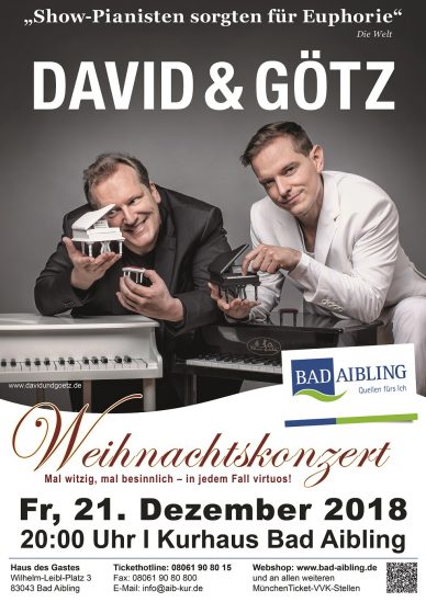 Die beiden Showpianisten David & Götz begeistern am Freitag, 21. Dezember, um 20:00 Uhr mit ihrem besonderen Weihnachtsprogramm die Konzertbesucher im Kurhaus Bad Aibling. Tickets sind ab 19 Euro im Haus des Gastes Bad Aibling und an allen weiteren MünchenTicket-Vorverkaufsstellen erhältlich.