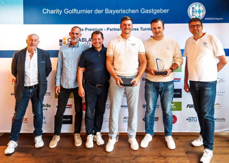 Bericht und Bilder: DEHOGA Bayern – Auf dem Bild mit den Personen sind u.a. die Sieger des Golfturniers Ludwig Maus und Niclas Gimmy zu sehen.
