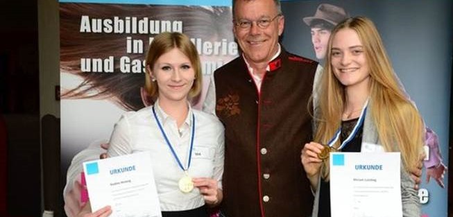 Bildunterschrift: Schirmherr Hotelier Sebastian Reisigl ehrt die Siegerinnen der Bayerischen Jugendmeisterschaften 2019 in den gastgewerblichen Berufen Hotelkaufleute und Fachleute für Systemgastronomie, Nadine Heissig vom Cafe Amsl Paan e.K in Passau (links) und Miriam Liesting, Platz Hotel München im Hotel Oberstdorf in Oberstdorf