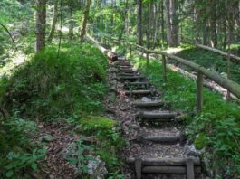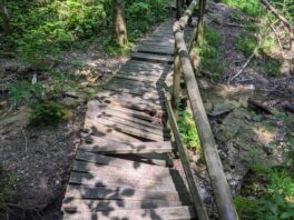 Der Steig durch den Wald ist teilweise beschädigt, ein Steg defekt, ein Warnschild kündet von “Berg in Bewegung”. Wir fühlen uns kurz an den Bergsturz in der Schweiz erinnert – zum Glück ist hier nur der Weg betroffen. Wir umgehen die Stelle problemlos. In Gegenrichtung ist der Weg sogar offiziell gesperrt und eine Umleitung eingerichtet.