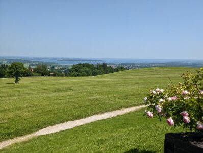 An der Straße nach Hintergschwendt erreichen wir schließlich die Seiseralm. Nach einem kurzen Stück auf der Fahrstraße gelangen wir zum Restaurant Seiserhof. Die Terrasse ist gut besucht, aber wir finden einen Platz. Der Ausblick von hier auf den Chiemsee ist schlichtweg atemberaubend – unserer Meinung nach einer der schönsten überhaupt auf das “Bayerische Meer”.