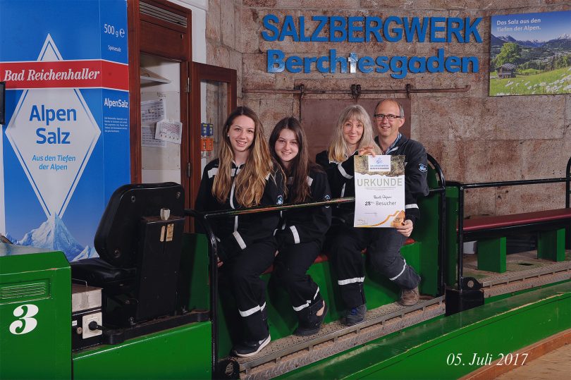 Das älteste aktive Salzbergwerk Deutschlands feiert dieses Jahr sein 500-jähriges Bestehen und heute mit dem 28 millionsten Besucher ein beeindruckendes Gästeaufkommen. Mit Gründung des Besucherbergwerks Mitte des 19. Jahrhunderts war ausschließlich privilegierten Personen, wie Adeligen oder Regierungsbeamten gegönnt, das Berchtesgadener Salzbergwerk zu besichtigen. Heute sind es pro Jahr mehr als 380.000 Besucher aus dem In- und Ausland, die in die Welt des Salzes unter Tage eintauchen. Seit 1945 werden die Gäste systematisch gezählt, um die Besichtigungstouren zeitlich genau auf die Besucher abzustimmen. Heute war es dan so weit. Mit Spannung wurde der 28 Mio. Gast erwartet. „Für Sie ist heute der Eintritt frei, Sie sind der 28 millionste Besucher“, beglückwünschte Martina Brandner, Mitarbeiterin des Salzbergwerkes, die erstaunten Gäste an der Kasse. Das Ehepaar Wagner mit den beiden Töchtern aus dem Saarland konnte es kaum glauben, dass ausgerechnet sie die Glückspilze sein sollten. Peter Botzleiner-Reber, touristischer Leiter des Salzbergwerks, überreichte der Familie eine Urkunde, verbunden mit einem Übernachtungsgutschein im Berchtesgadener 4 Sterne+-Hotel Edelweiß, sowie einer Chronik zum Salzabbau in Berchtesgaden. Damit war es auch offiziell vom Salzbergwerk Berchtesgaden bestätigt.