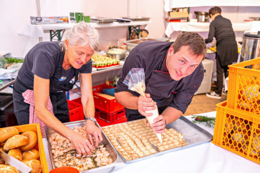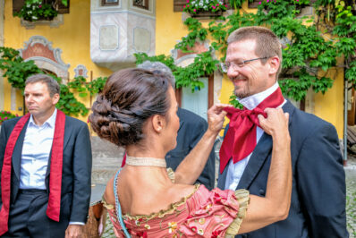 Doch bevor der erste Satz gesprochen wurde, lag hinter den Beteiligten bereits ein langer Tag voller Emotion, Konzentration und akribischer Vorbereitung. In den improvisierten Maskenräumen in der Werkstatt des Kirchenmalers Michael Pertl direkt am Marktplatz herrschte am späten Nachmittag ein emsiges Treiben: Haare wurden kunstvoll geflochten, Schminke aufgetragen, Requisiten zurechtgelegt und letzte Handgriffe an Kostümen und Krawatten vorgenommen.