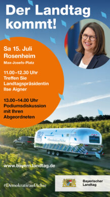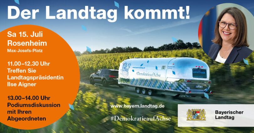 •Am Samstag, den 15.07.2023, kommt der Bayerische Landtag von 10 Uhr bis 16 Uhr mit dem LandTruck, einem umgebauten Oldtimer-Trailer, auf den Max-Josefs-Platz von Rosenheim. Neben Landtagpräsidentin Ilse Aigner (CSU) und Vizepräsident Markus Rinderspacher (SPD) werden auch die Abgeordneten Klaus Stöttner (CSU), Claudia Köhler (BÜNDNIS 90/DIE GRÜNEN), Nikolaus Kraus (FREIE WÄHLER), Andreas Winhart (AfD) und Martin Hagen (FDP) für Gespräche am LandTruck zur Verfügung stehen.