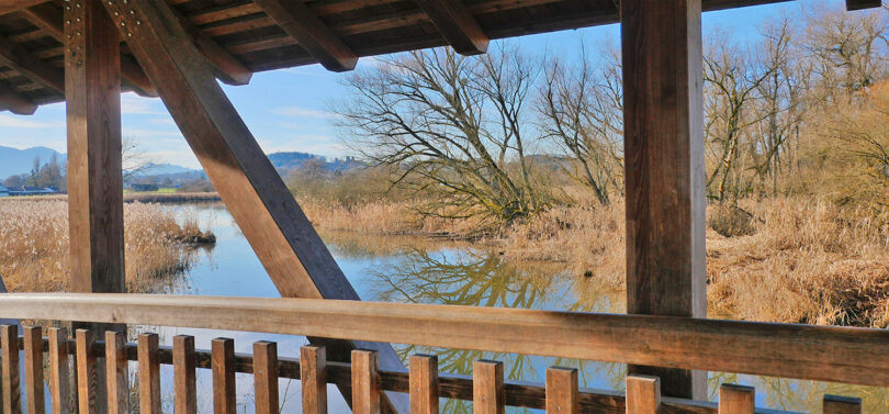 Nach dem kurzen Winterintermezzo erinnern nicht einmal mehr schneebedeckte Berge an die “kalte” Jahreszeit. Der Blick vom Uferweg erinnert in den warmen Tönen an den Herbst, während in den Auwäldern der Buntspecht sich auch mal ganz offen sonnt.