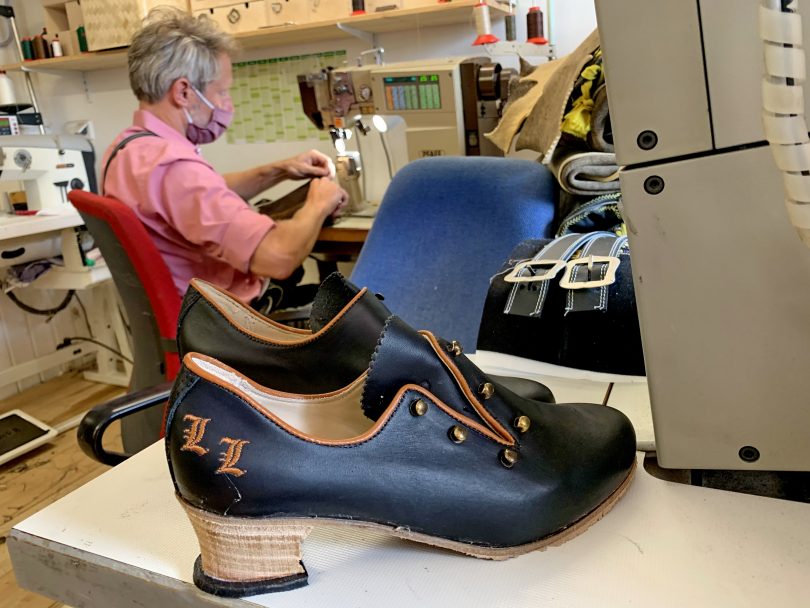 Fotos: Hötzelsperger – Der Damenhaferlschuh, der von Michael Auer (im Hintergrund) in individueller Handarbeit gefertigt wird.