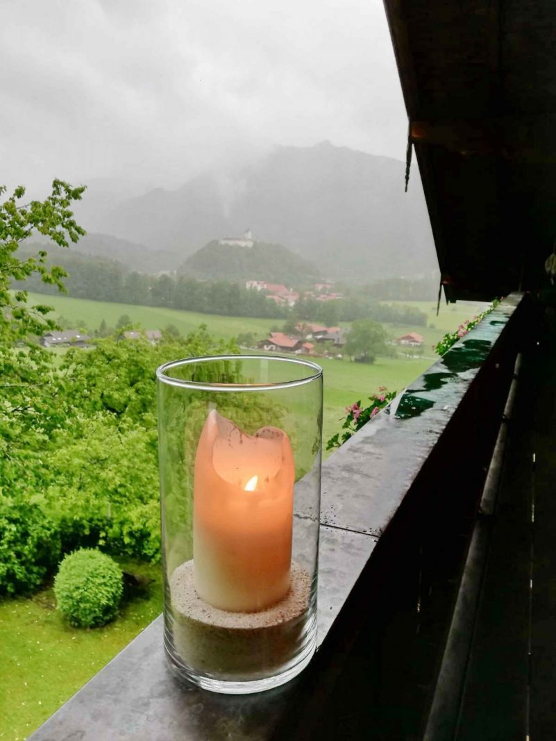 Auch Rosemarie Anner als langjähriges Vereinsmitglied, die zu Füßen von Schloss Hohenaschau und nahe dem Cafe Brucker in der Schlossbergstraße wohnt, zündete an ihrem Fenster eine Kerze an. Als die Glocken der Schlosskapelle erklangen, wurden in ihr Erinnerungen wach und sie weiß zu erzählen: „Früher war es Brauch, dass das Geläut ertönte, wenn im nahen Ortsteil Bach Jemand verstarb. Wenn der Sarg dann auf dem sogenannten Kirchenweg zusammen mit den Angehörigen zum Aschauer Friedhof gebracht wurde, dann ertönten die Glocken so lange wie der Trauerzug mit dem Schloss in Sichtverbindung war. Das letzte Mal, dass die Glocken für einen Toten durchgeläutet haben war Mitte der Fünfziger Jahre für einen Kaspar Stadler aus Bach“. Für Rosemarie Anner war das Gedenken mit Kerzen etwas besonders Berührendes, gerade weil vor wenigen Monaten ihr Mann Franz verstarb und weil all ihre Familienmitglieder mit dem Trachtenverein Hohenaschau eng verbunden sind. Für Vorstand Claus Reiter hat das Vereinsjahr durch Corona einen vollkommen neuen Verlauf genommen, nicht nur, dass die Proben, Zusammenkünfte und Veranstaltungen für die Sommerzeit abgesagt sind. Große Vorfreude herrschte bereits, weil der GTEV Hohenaschau Göd beim GTEV Bergen ist und damit beim großen Gaufest des Gauverbandes I in Bergen schön mitgefeiert hätte. „Für dieses Fest haben wir bereits mit den Trachtenvereinen von Vachendorf und Grabenstätt, bei denen die Bergener Trachtler Pate sind, ein gemeinsames Fahnenband angeschafft. Hoffen wir, dass wir die feierliche Übergabe nachholen können“ – so Vorstand Claus Reiter, dessen weitere Hoffnung noch ist, dass der letzte für heuer geplante Heimatabend am 2. Oktober in der Aschauer Festhalle doch noch stattfinden kann.