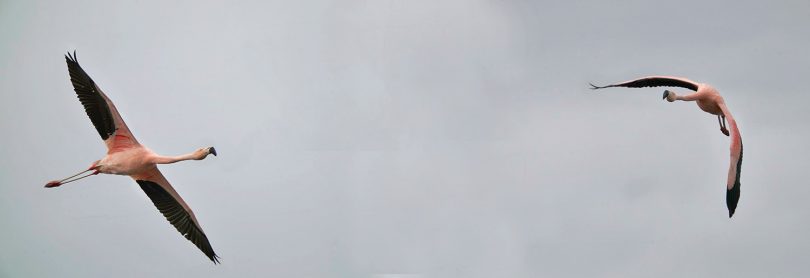 Der Flamingo hatte sich recht nah, südlich vom Steg, niedergelassen. Er flog so dicht vorbei, daß ich Mühe hatte ihn im Bild zu behalten ohne Teile von ihm abzuschneiden (mit 1200mm Brennweite ist das schwieriger als es auf dem Bild aussieht).