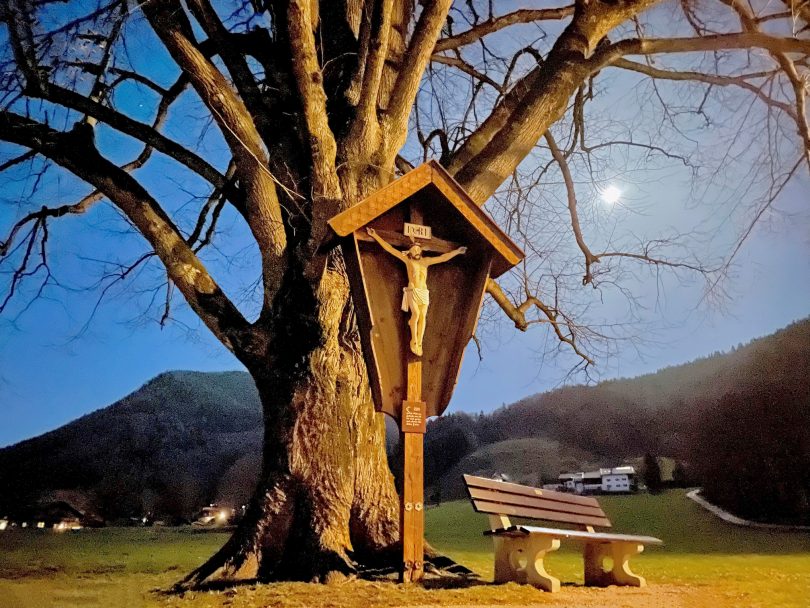 Hell erstrahlt nun zur Vollmondzeit der einzige natürliche Satellit der Erde in besonderer Pracht. Viele Blicke zieht der Mond gerade in dieser Zeit auf sich und gibt Anlass zum Staunen. Unsere Erde erleuchtet dabei in einem anderen Licht und gibt mystische und stimmungsvolle Bilder ab. Am Abend sich aufmachen und bei einem kleinen Fußmarsch durch die Straßen eine Runden drehen. Momente der Besinnung werden einen dabei beschert und man kommt oftmals an stimmungsvollen und zugleich andächtigen Plätzen vorbei. Das Feldkreuz an der evangelischen Kirche Aschau zeigt sich geborgen unter durch die mächtigen Linde strahlt der Vollmond mit aller Wucht. Doch wie es so oft im Leben ist, des einen Freud, des anderen Leid. Diese Mondphase kann nämlich auch für manch einen dunkle Seiten mit sich bringen. Schlaflosigkeit und Unruhe können oftmals bei Vollmond die Nacht zum Tag werden lassen.