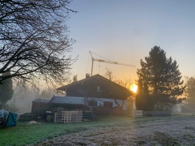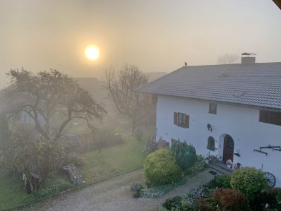 Aufgrund des Morgennebels kam es zum Wochenstart in Prien-Prutdorf nicht zu einem hellen Sonnenaufgang – dennoch aber machte sich die ganze Sonne sichtbar und setzte sich gegen den Nebel durch. Unsere Aufnahme zeigt die “Nebel-Sonne” mit einer ganz besonderen Stimmung.