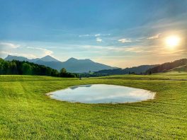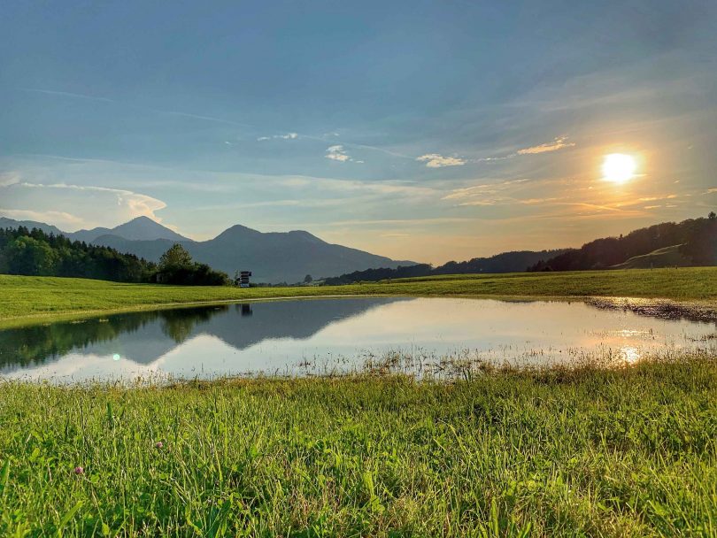 Der Starkregen der letzten Woche zeigt seine Hinterbliebenschaften auch noch an diesen Tagen. Zu einem regelrechten See in der Wiese, hat sich das Nass wie hier in Außerkoy bei Aschau i.Chiemgau angesammelt. Eine besondere Stimmung gibt es dabei beim Sonnenuntergang. Zur Abendstunde senkt sich der strahlende Planet und dazu spiegelt sich die Bergsilhouette von Zellerhorn und Aschauer-Kopf. Bei diesem Anblick ist kaum zu erahnen, was für Kräfte und Verwüstungen sich letzte Woche in der heimischen Natur abgespielt haben.