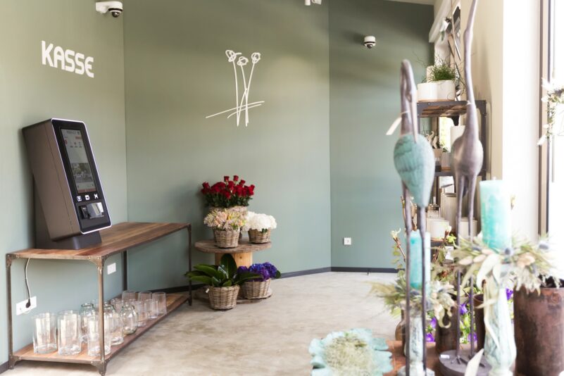 Seit gut einem Jahr gibt es zusätzlich noch etwas Neues bei Blumen Elsperger-Weiss – einen Selbstbedienungsladen, der täglich von 5:00 bis 23:00 Uhr geöffnet ist und in dem noch weitere Sträuße, Töpfe, Grußkarten und Geschenkartikel zu finden sind. „Meistens schauen hier Personen rein, die am Automaten nicht das passende gefunden haben“, so Marion Schmid. Betreten kann man den SB-Laden mit seiner Bank- oder Kreditkarte, ähnlich, wie man einen Bankraum nach den Öffnungszeiten betritt, um zum Bankomaten oder dem Kontoauszugsdrucker zu kommen. Bezahlt wird ebenfalls mit jeder beliebigen Bezahlkarte an einem Terminal. Der SB-Laden funktioniert hierbei vollkommen autark und das nicht nur beim Bezahlen, sondern auch was die Energieerzeugung und -nutzung betrifft.