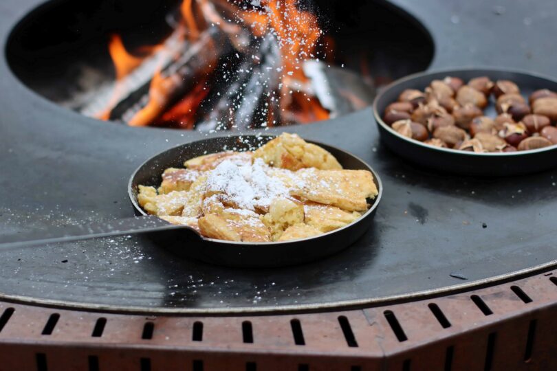 „Ich habe mit meinem Betrieb schon immer viel im Ofenspektrum und Designbereich gearbeitet, da war der Schritt zu diesem Grill fast logisch“, berichtet er. Bei der Konzeption des Kugelblitz-Grills trieben ihn vor allem zwei Gedanken um: Die bereits erwähnte Faszination der Menschen fürs Feuer und das gesunde Grillen. Denn anders als bei den allseits bekannten Holzkohle-Kugelgrills kommt hier das Grillgut nicht direkt auf die Glut oder das Feuer. Steaks, Würstl oder Grillgemüse werden auf einen großen Stahlring gelegt – und in der Mitte lodert das Feuer. Schädliche und krebserregende Stoffe, die sich bei anderen Grills fast unweigerlich in den Lebensmitteln absetzen, haben hier keine Chance.