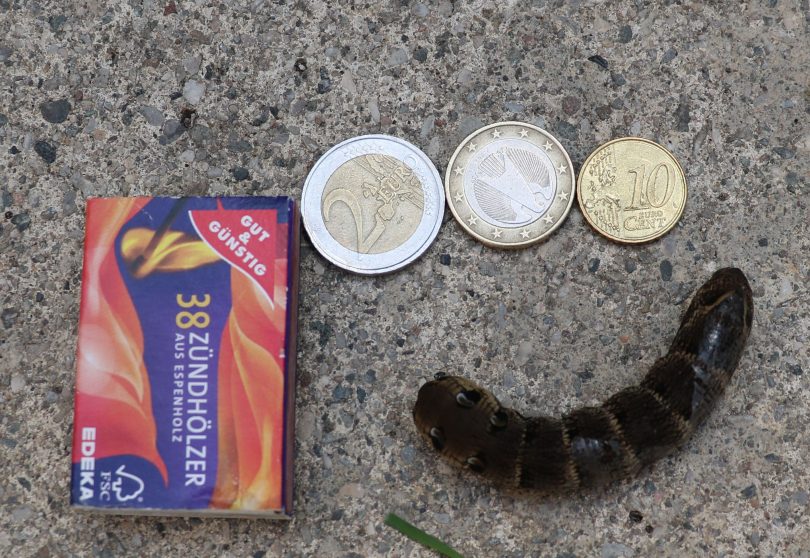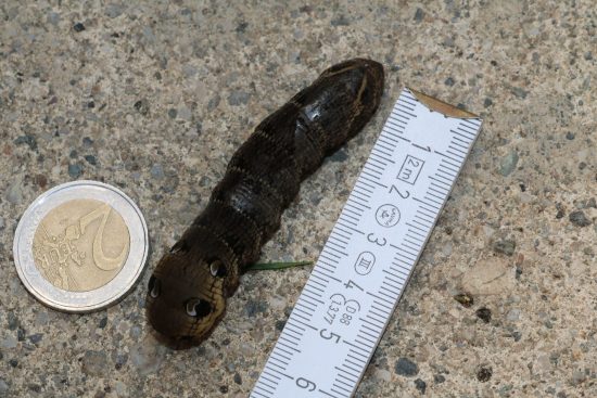 Naturkunde – live, auch in den Ferien kann man lernen: eine Riesenraupe fanden die Mitterreither Kinder im Garten, keiner konnte sich daran erinnern je ein solches Prachtexemplar in braun mit schwarzen Augenflecken hinten gesehen zu haben. Mit einem schnellen Griff zum Schmetterlingsbuch war der seltene Gast identifiziert: die Raupe eines mittleren Weinschwärmers hatte den Weg nach Mitterreith gefunden. Nach dem Buch durfte die Raupe 80 Millimeter lang sein, tatsächlich brachte sie 60 Millimeter zusammen. Bis aus der Raupe ein ausgewachsener Schmetterling wird, der mit seinem Rüssel Nektar aus den Blüten der Fuchsien und Balkonblumen in Mitterreith saugt, wird noch einmal ein Jahr vergehen. Der Mittlere Weinschwärmer (Deilephila elpenor) ist ein Schmetterling (Nachtfalter) aus der Familie der Schwärmer (Sphingidae). Die nachtaktiven Falter fliegen Blüten zum Nektarsaugen an und erreichen eine Flügelspannweite von 45 bis 60 Millimetern.