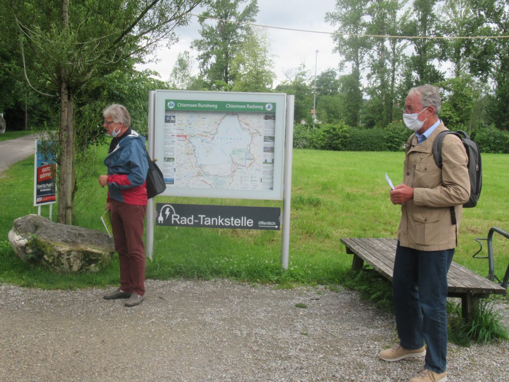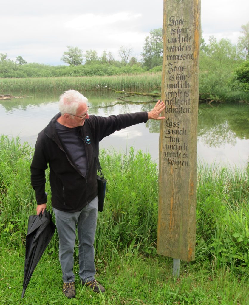 Nachdem sich die zwei Neuen beim Kiosk vor dem Rimstinger Bad kurz vorstellten und über die geologische Entstehung und Entwicklung des Chiemsees informierten, ging es an der Prien entlang bis zur Rialto-Brücke und dann zur Prien-Mündung. Bei mehreren Stopps erfuhr man von den neuen Naturführern viel Wissenswertes über die Tierwelt im Mündungsgebiet der Prien. Die beiden erzählten daneben auch launige Geschichten über berühmte Personen vergangener Zeiten, die sich am Chiemsee niederliessen und beantworteten Fragen. Groß war z.B. die Nachfrage zu den erstaunlichen Aktivitäten der Biber, die hier seit einigen Jahren leben und die schon jede Menge Weiden zu Fall gebracht haben.