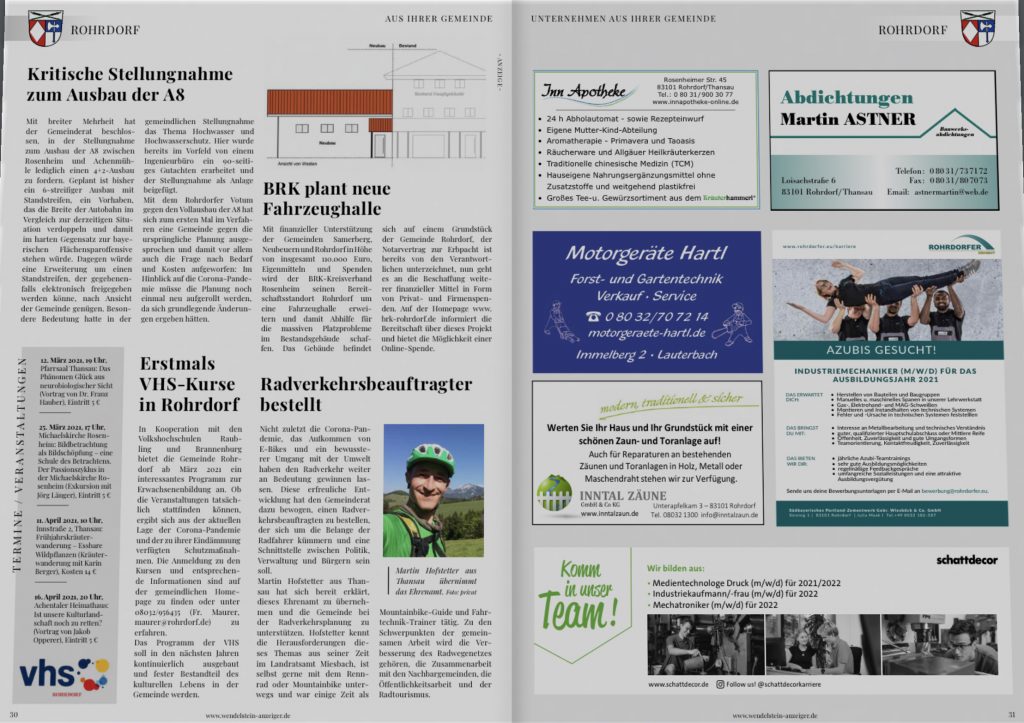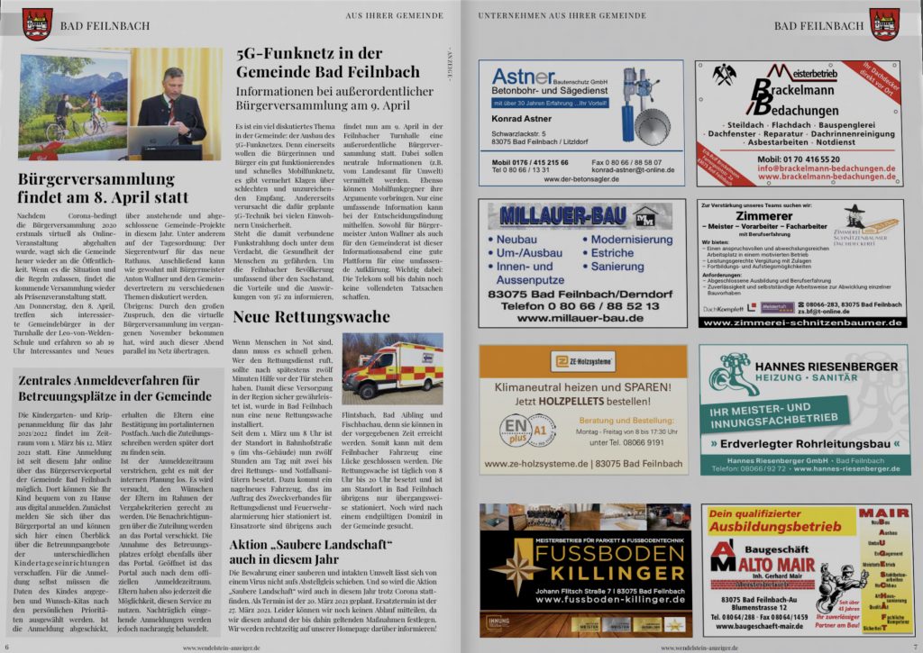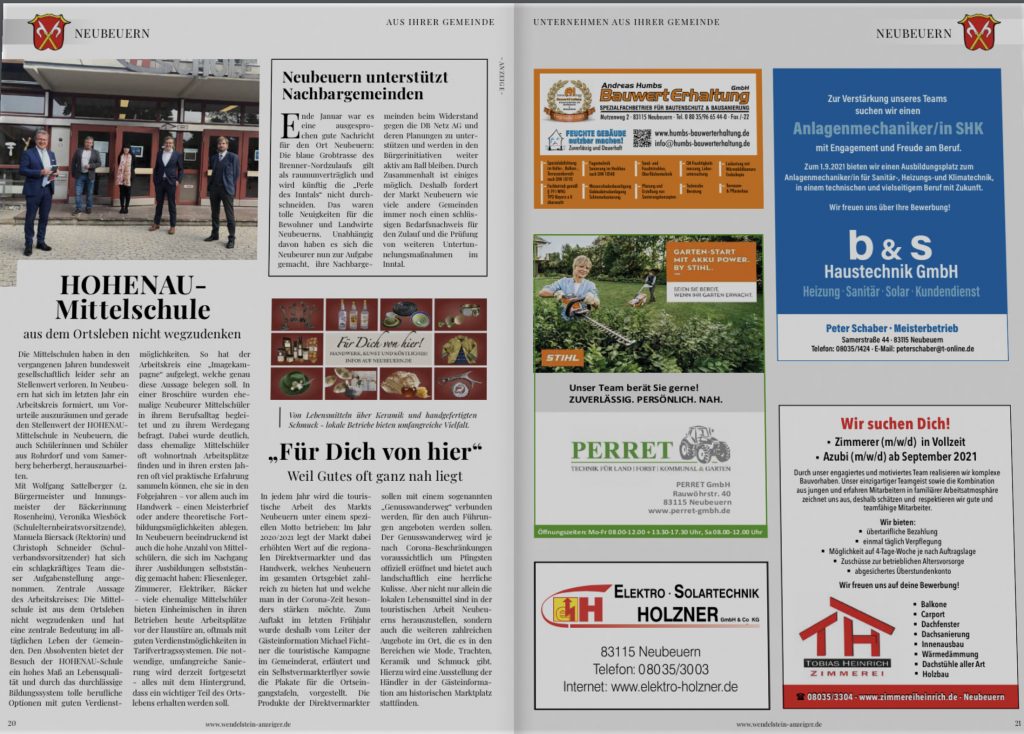 [real3dflipbook id=’1′]Für den Neustart des seit 25 Jahren in Inn- und Mangfalltal fest etablierten Wendelstein-Anzeigers haben wir das Layout deutlich verjüngt, das redaktionelle Konzept überarbeitet und an vielen anderen kleinen Stellschrauben gedreht. Zur Neuausrichtung gehört auch die Zusammenarbeit mit starken Kooperationspartnern aus der regionalen Medienwelt, unter anderem den „Samerberger Nachrichten“.