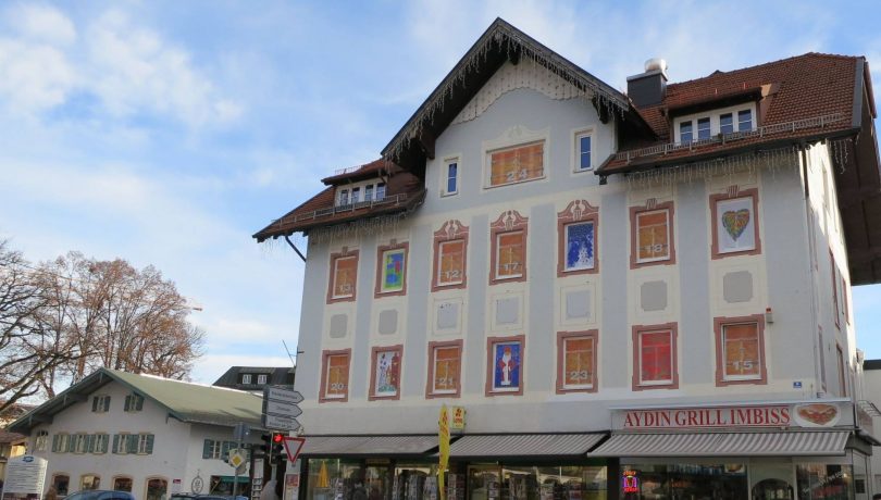 Foto: Prien Marketing GmbH – Auch im öffentlichen Raum öffnet sich täglich ein neues Türchen – die Gebäudefassade am Marktplatz 2, direkt an der großen Kreuzung, verwandelt sich auch in diesem Jahr in einen übergroßen Adventskalender.