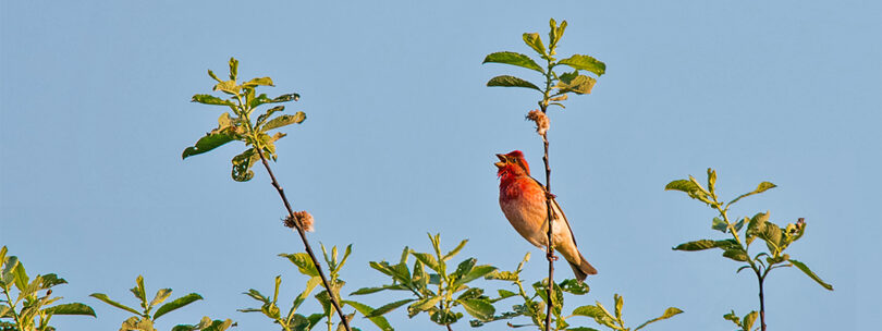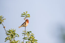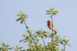 Der “Ruf” des Karmingimpel … oder vielmehr die ersten Sichtungen vor ein paar Wochen haben mich in das Grabenstätter Moos geführt. Auch wenn der “Ruf” klar und deutlich ist, so ist er selbst oft schwer zu entdecken. Stattdessen zeigte sich ein Teichrohrsänger und im Morgenlicht saßen drei Rotfußfalken nebeneinander auf der Stromleitung und in ein paar Meter Entfernung noch ein vierter. Schließlich positionierte sich der Karmingimpel dann doch noch schön im Sonnenlicht oben auf dem Buschwerk.
