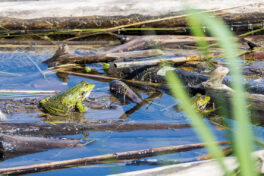 Vor dem Turm an der Hirschauer Bucht quakten noch ein paar Teichfrösche, zwei Bachstelzen waren auf Nahrungssuche für den Nachwuchs und eine Stockente schwamm mit ihren vier Kücken am Turm vorbei. Zu guter Letzt flogen noch ein Schwarzspecht, ein Kiebitz und ein Kuckuck nahe am Turm vorbei.