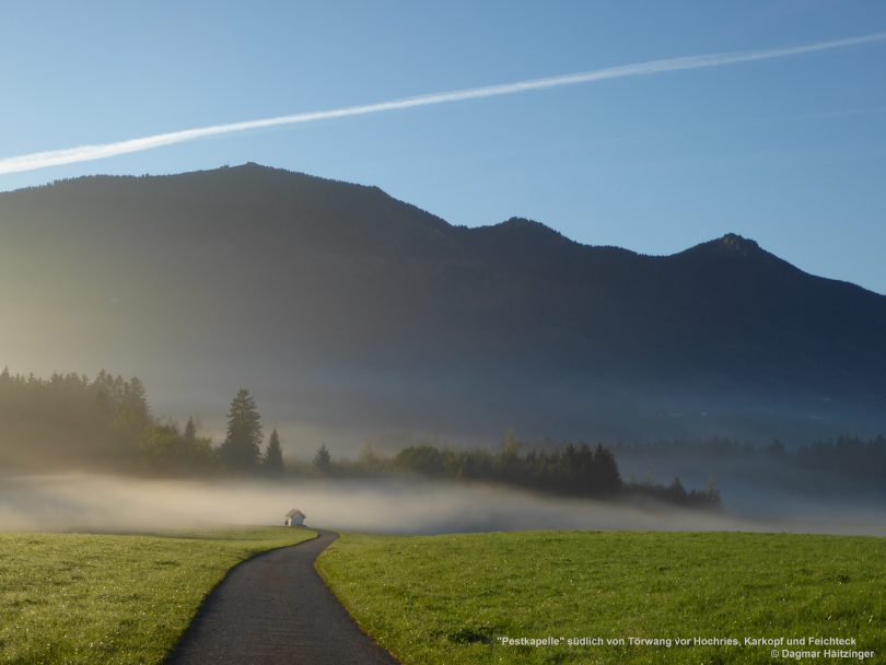 Foto: Dagmar Haitzinger mit Kalender-Titelbild – Bildunterschrift: “Pestkapelle” südlich von Törwang vor Hochries, Karkopf und Feichteck
