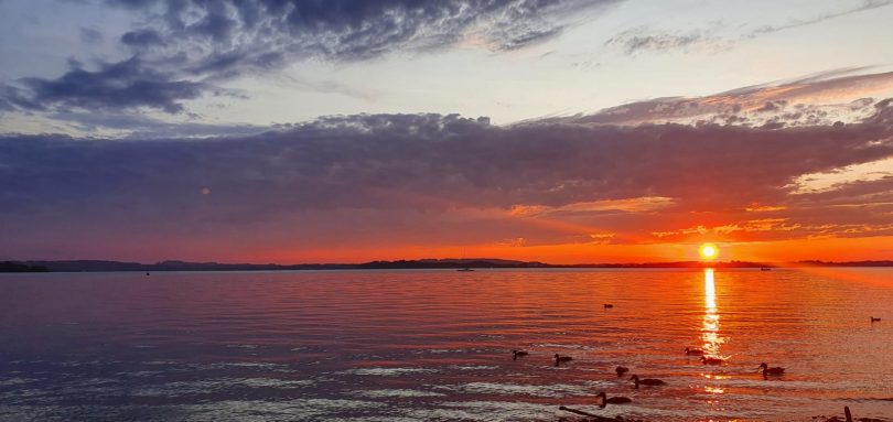 In Übersee am Chiemsee ist der Sonnenuntergang noch etwas mehr besonders als vielleicht anderswo – dies zeigt diese aktuelle Aufnahme vom Samstagabend von der Sundowner-Bar mit Blick hinaus ins Bayerische Meer und mit einer faszinierenden Farb- Landschafts-Komposition.