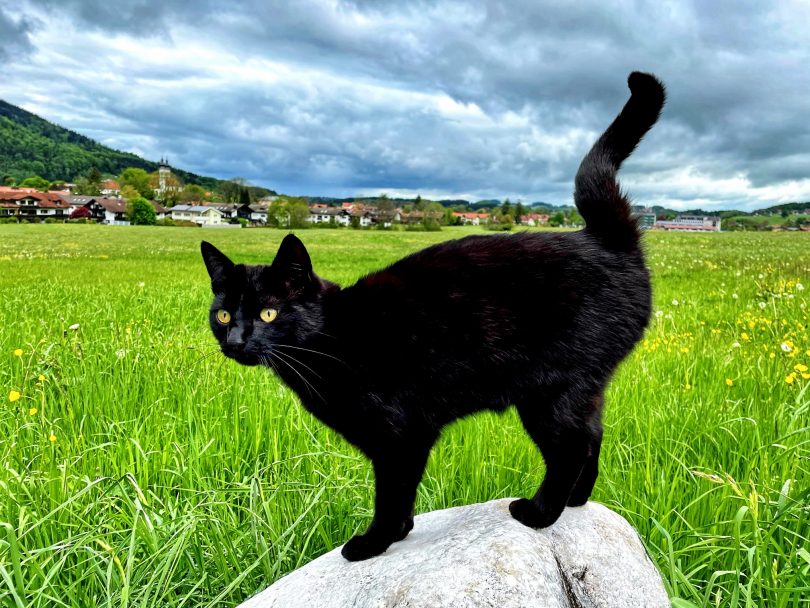 Normalerweise ist es nicht wert, sich über das Wetter Gedanken zu machen. Doch allmählich schlägt es bei dem ein oder anderen schon aufs Gemüt. Doch das ist nicht nur bei uns Menschen so, sondern anscheinend auch bei den Vierbeinern. Schnurrend, zugleich herhaben und mit leichtem Katzenbuckel zeigt sich der schwarze Kater Fidibus. Über Aschau i.Chiemgau ziehen Regenwolken auf und diese ähneln durch ihre Dunkelheit schon fasst der schwarzen Fellfarbe vom anschmiegsamen Samtpfötchen Fidibus. Doch der Aberglaube ob eine schwarze Katze Glück oder Unglück bringt, hängt davon ab, ob man eine Maus ist oder ein Mensch ist. Eins ist sicher, der Schnurrer mit dem schönen Fell ist, wie hier am Fuße der Kampenwand, schön anzuschauen.