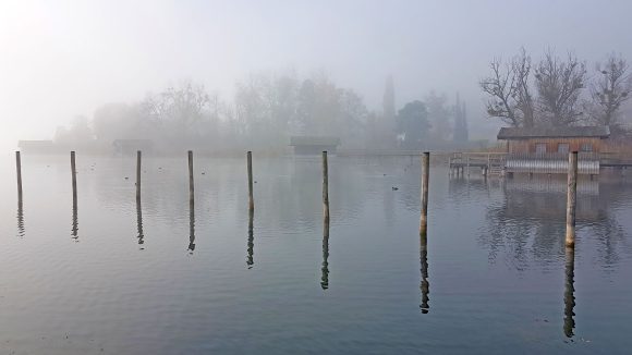 - Noch liegt Nebel über dem See, während in der Bucht bereits die Sonne scheint und der blaue sich Himmel zeigt.
