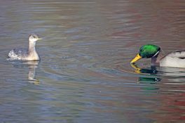 - Zuerst läst sich ein Rothalstaucher sehen. Lässig ist er unterwegs. Als er sich einem Stockenten Männchen im Prachtkleid nähert, wird die Situation von beiden beäugt. Als der Rothalstaucher die Stockente passiert, schnattert diese, vielleicht erleichtert? Zwischen Tauchgängen pflegt der Rothalstaucher sein Gefieder.