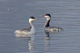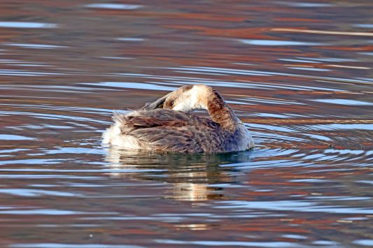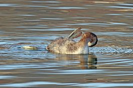 - Auch das Ohrentaucherpärchen zeigt sich wieder. Sie scheinen sich über die nächsten Schritte nonverbal abzustimmen. Denn anschließend wird abwechselnd Gefieder geputzt oder getaucht.