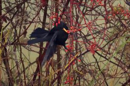 - Am Ufer pflück eine Amsel rote Beeren. Sie muss sich dazu artistisch anstrengen, um an diese zu kommen. Mit kräftigem schnellem Flügelschlag hält sie die Balance und schafft es, einige dieser Beeren zu erhaschen.