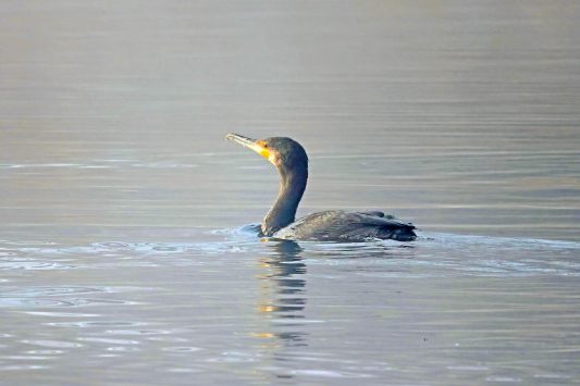 - Ein Kormoran kommt vom See in die Bucht eingeflogen, durch den Nebel ist er erst spät zu erkennen.
