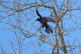 - Eine Rabenkrähe landet auf einem der am Ufer stehenden Bäume.