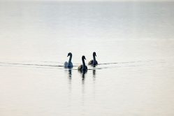 - Aus dem Nebel schwimmen drei Grazien in Richtung Bucht. Es sind drei Höckerschwäne, davon zwei Jungschwäne im ersten Jahr.