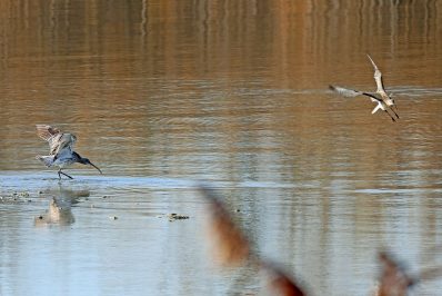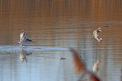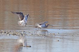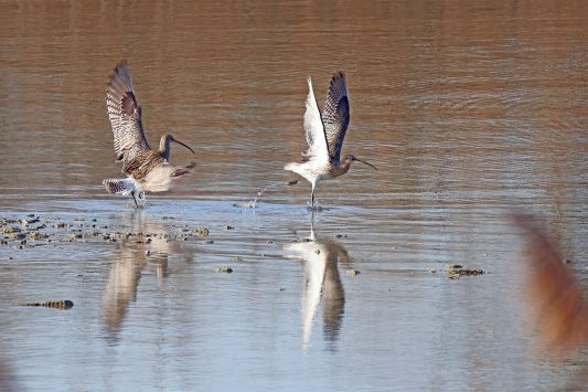 - Während ein oder zwei vor dem Turm auf Nahrungssuche sind, verstehen sich die beiden auf einer kleinen Sandbank stehenden Brachvögel nicht. Einer muß weichen und sucht das Weite.