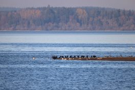 - Weit draußen auf einer Landzunge halten sich viele Kormorane und Graugänse auf.