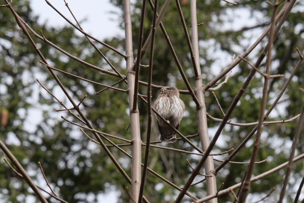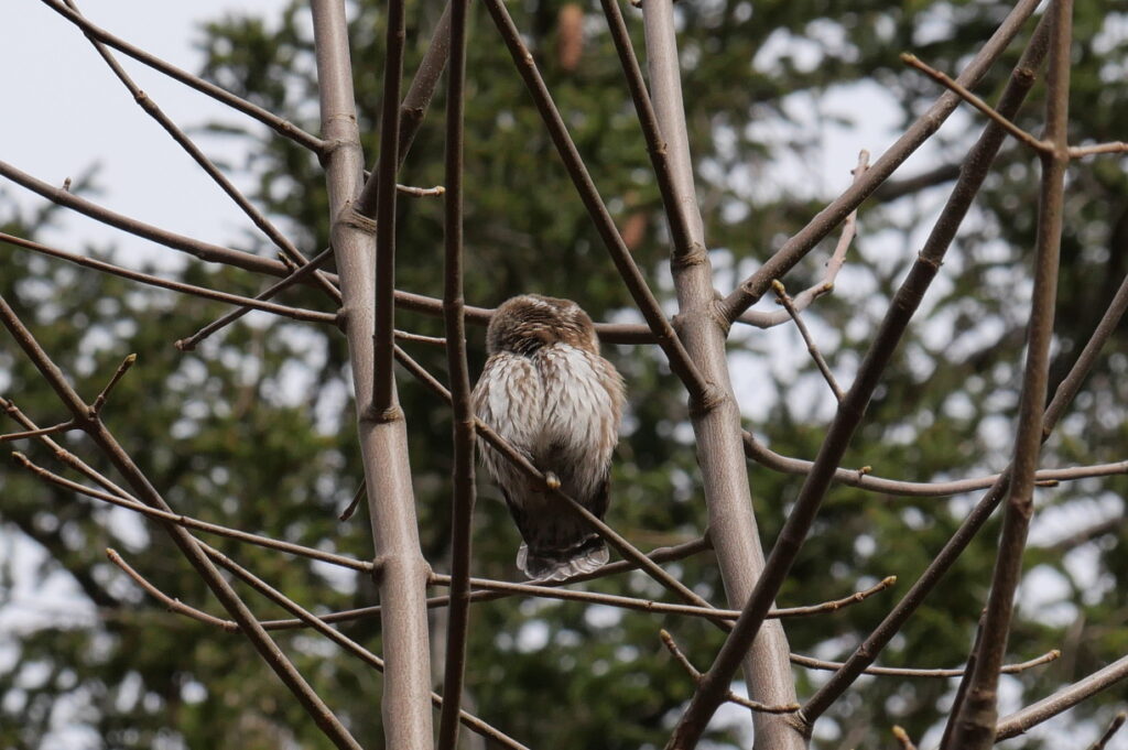 Normalerweise sitzt dieser hoch oben in der Spitze und ist schwer zu finden. Doch dieses mal konnte ich nicht nur über das Verhören diese seltene Eule nachweisen, sondern zum ersten Mal auch erblicken. Die Freude war natürlich groß, als nach einigem Warten der nette Kauz noch eine niedrige Sitzwarte anflog und auch das Scheingesicht auf dem Hinterkopf zeigte.