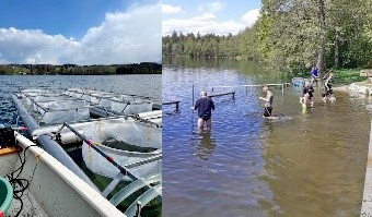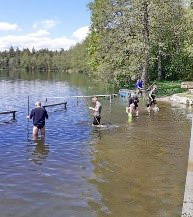 Ferner hatte der Gemeinderat bereits im Herbst letzten Jahr beschlossen, im Rahmen eines Eigenversuchs herauszufinden, ob sich handelsüblicher Quarzsand positiv auf die Mikrobiologie des Sees auswirken könnte. Aufgrund langjähriger Kontakte zur LMU München konnte die dortige limnologische Fakultät dafür gewonnen werden, dieses Projekt wissenschaftlich zu begleiten. Anhand von im See eingebrachten „Mesokosmen“ (siehe Foto) werden nunmehr exakte Analysen erstellt, welche künftig eine wertvolle Hilfe bei den Sanierungsmaßnahmen bilden könnten. Zeitgleich wird planmäßig das Quarzmehl bzw. der Quarzsand vom Boot aus über eine bestimmte Fläche verteilt in den See eingebracht.