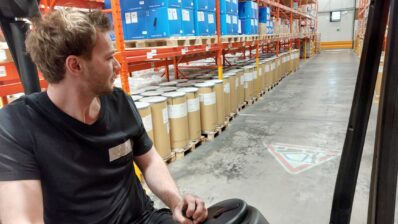 Weinberger geht vorbei an den weißen „Big Bags“, jede über eine Tonne schwer, rundherum türmen sich die massiven, rotlackierten Regalkonstruktionen. Bei Aenova am Standort Bad Aibling dreht sich alles um Nahrungsergänzungsmittel wie z.B. Vitaminpräparate und Arzneimittel – hier vor allem Brauseprodukte und die Verpackung von Tabletten, die in Schwesterwerken produziert werden. Dementsprechend vorsichtig müssen die Mitarbeitenden mit der Ware umgehen. Bis zu 100 Paletten kommen im Schnitt hier täglich im Wareneingang an, etwa 170 verlassen das Haus nach der Verarbeitung wieder. Hier ist alles in Bewegung, gut organisiert. Über den Weggabelungen hängen große abgerundete Spiegel von der Decke, die der Übersicht für die Staplerfahrerinnen und -fahrer dienen und ein bisschen wie schwebende Discokugeln aussehen.
