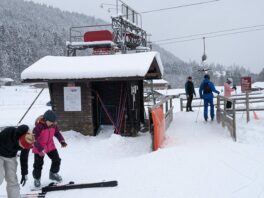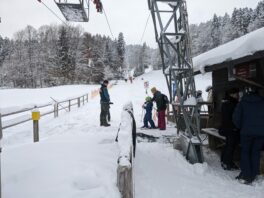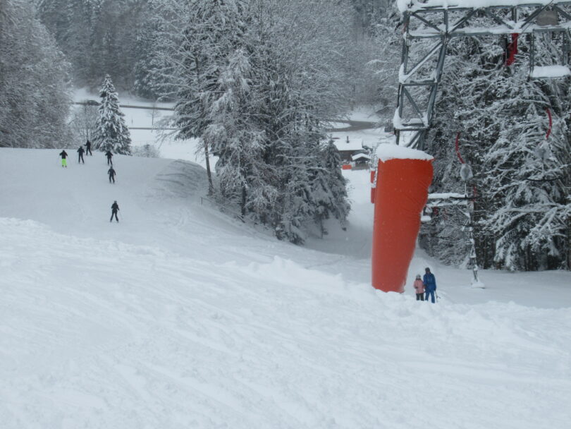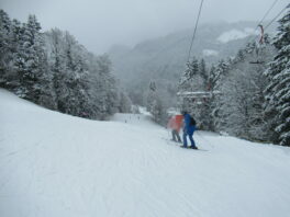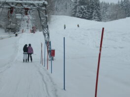 Also auf nach Sachrang, wo am Kaiserblicklift der Hang wie immer bestens präpariert ist. Wir müssen bevor es auf die Piste geht noch Skisets ausleihen, denn die Mädchen sind aus Skiern und Schuhen herausgewachsen. Das ist im praktischerweise gleich neben den Kaiserblick Stub´n liegenden Sportgeschäft problemlos und preisgünstig möglich. Dann geht´s zum Lift. Während der Woche gibt es keine Wartezeiten und der freundliche Mann am Einstieg hilft den Mädels sogar beim Einstieg in die Bindung, die ganz anders funktioniert wie bei den alten Brettern.