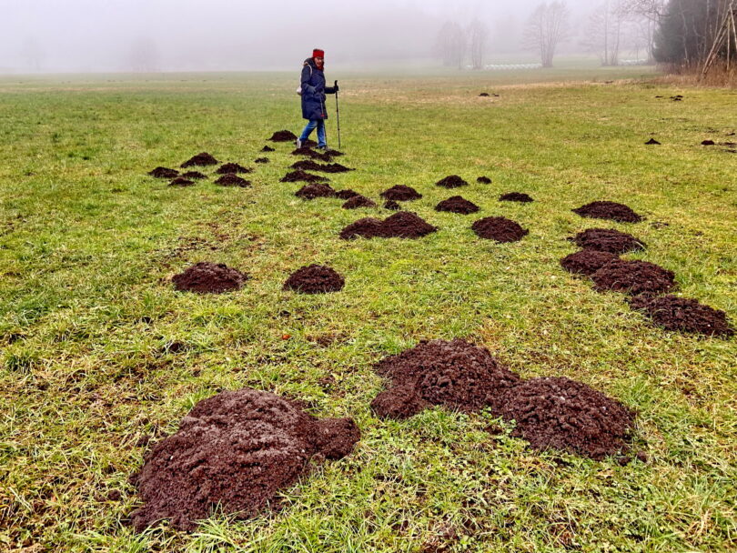 Wer schert sich schon um einen Maulwurfshügel? Dazu heißt es auf wikipedia: „Unter einem Maulwurfshügel (auch Scherhaufen) oder einem Maulwurfshaufen versteht man den aufgeworfenen Erdaushub des Maulwurfs. Die beim Graben anfallende Erde schiebt der Maulwurf mit dem Kopf beziehungsweise dem Rüssel je nach Bodenbeschaffenheit alle 50–100 cm an die Erdoberfläche, wodurch die typischen, circa 25 cm hohen Erdhaufen entstehen. Die Maulwurfshaufen befinden sich im Allgemeinen nicht über den Gängen, sondern seitlich darüber, weil die Erde schräg nach oben gedrückt wird. Damit wird der Maulwurf seinem Namen gerecht, der sich vom (althochdeutschen) „molte“ für „Erde“ ableitet. Der Maulwurf könnte also auch „Erdwerfer“ heißen“.