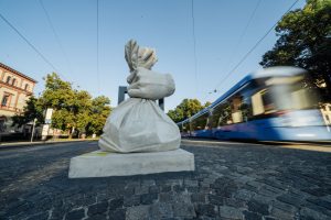 Die Skulptur “Geldsack” auf dem Maximiliansplatz stammt von Johannes Vetter. Foto: LEROT Leon Greiner