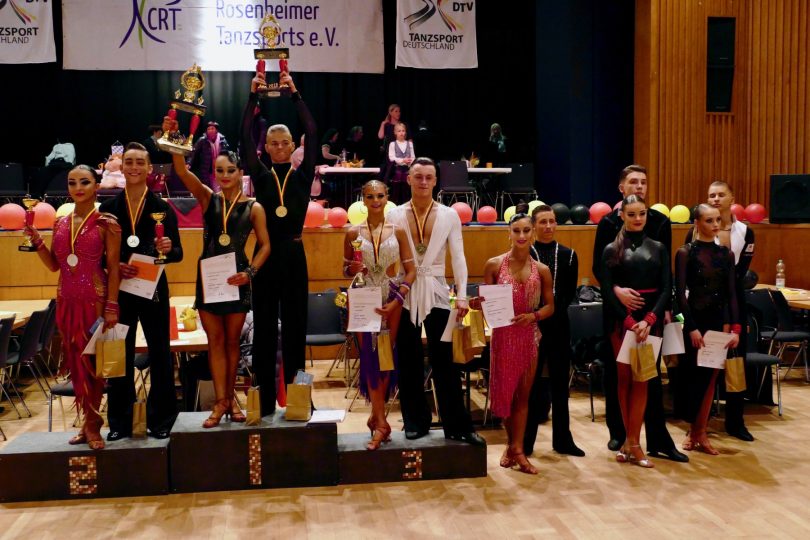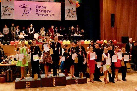 Am 23.02.2019 lud der Club des Rosenheimer Tanzsports e.V. Paare aus ganz Deutschland zu den Meisterschaften nach Bad Aibling ein. Trotz den anfänglichen technischen Problemen konnte das Turnier der Junioren I B-Latein pünktlich um 13Uhr beginnen. In der Vorrunde starteten insgesamt 35 der ursprünglich 43 gemeldeten Paare. Nach zwei weiteren Zwischenrunden stand das Finale der 11 – 12-jährigen mit zweifacher bayerischer Beteiligung fest. Letztendlich ging der Sieg und somit der Titel des Deutschen Meisters recht eindeutig mit 25 der möglichen 35 Wertungen für Platz eins nach Bremen an das Paar Dimitrii Kalistov und Luna Maria Albanese. Das bayerische Paar Peter Janzen / Lilien Wilhelm vom TTC Erlangen konnte den Vizemeistertitel für sich behaupten. Ebenfalls pünktlich begann das Turnier der Junioren II (13-14-jährig) B-Latein um 16:30Uhr mit insgesamt 49 der ursprünglich 75 gemeldeten Paaren. Hier mussten die Teilnehmer schon vier Runden tanzen um in das Finale einzuziehen. Den Meistertitel ertanzten sich in dieser Klasse das Paar Elias Nazarenus und Angelina Weber vom Schwarz-Weiß-Club Pforzheim (Baden Württemberg).