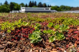 Dachbegrünung (in Kombination Photovoltaikanlagen) auf dem neuen Produktionsgebäude in Bruckmühl.