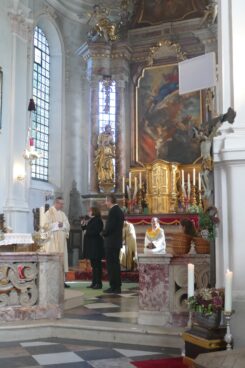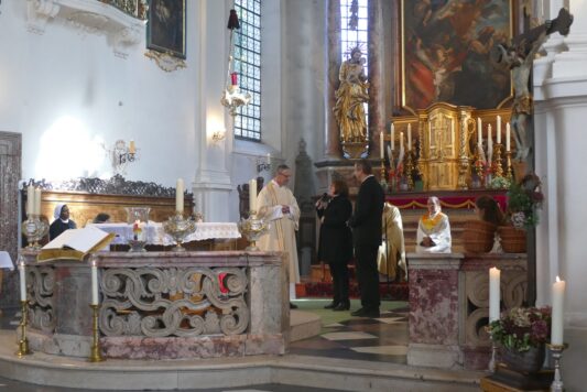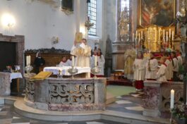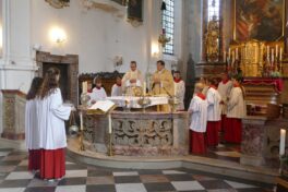 Am Kirchweihsonntag konnte im Rahmen eines feierlichen Gottesdienstes Pfarradministrator Gottfried Grengel, umgeben von einer großen Schar Ministranten, den neuen Diakon Michael Leberle begrüßen.