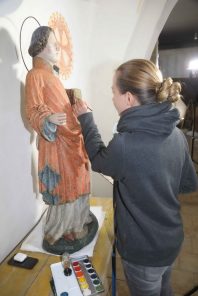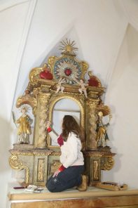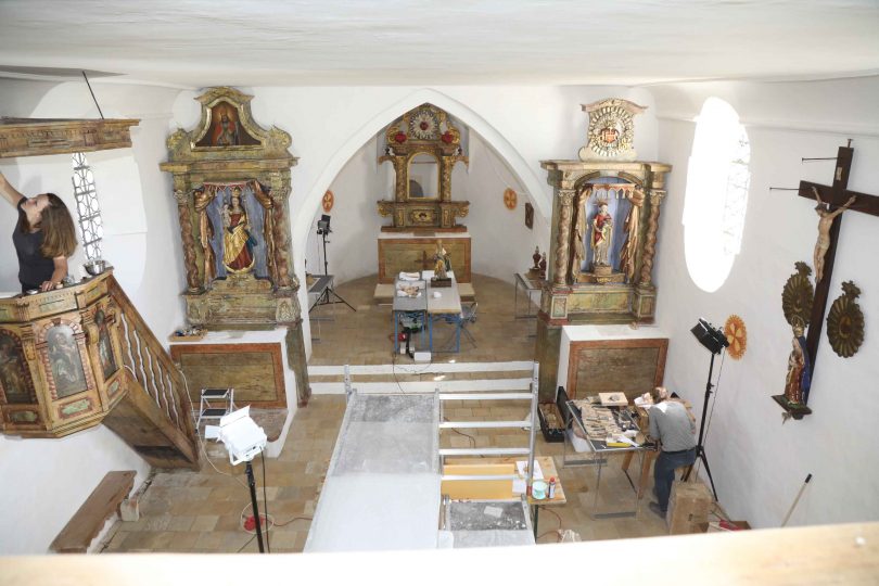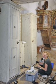 Bericht und Bilder: Hans Kronseder – 3940 Die Diplom-Restauratorin bei ihrer Arbeit auf der Kanzel -3982 Blick auf den hinteren Teil der Kirche mit eine der ältesten Emporen im gesamten süddeutschen Raum und weitere