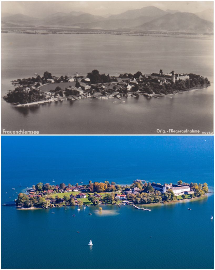Ein aufmerksamer Leser der Samerberger Nachrichten aus Neustadt bei Bonn hat der Redaktion dieser Tage eine Fliegeraufnahme von Frauenchiemsee aus dem Jahr 1940 zugesandt, die in der Perspektive sehr einer Aufnahme ähnelt, die Rainer Nitzsche im vorigen Jahr, also 2018, aus dem Flugzeug von Frauenchiemsee gemacht hat. Die Pilotin bei diesem Rundflug war Ingrid Hopman im Alter von 79 Jahren. Die ältere Fliegeraufnahme ist also etwa im Geburtsjahr der Pilotin entstanden.